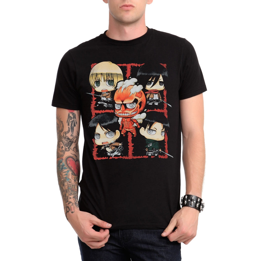 Be the first of your friends to get the exclusive Attack of Titan gear featuring four cartoonish chibi-style characters of Armin, Mikasa, Eren and Levi all ready to cut down the Colossal Titan. This great t-shirt is a must-have for Attack on Titan fans! This black, standard fit adult t-shirt is made of 100% cotton. Be sure to check out our Size Chart to get an idea of the average size and dimensions of this Attack of Titan Chibi Characters tshirt style. Check back often for some of our new Attack on Titan clothing and other Attack on Titan merchandise at great prices only at AnimationShops.com.