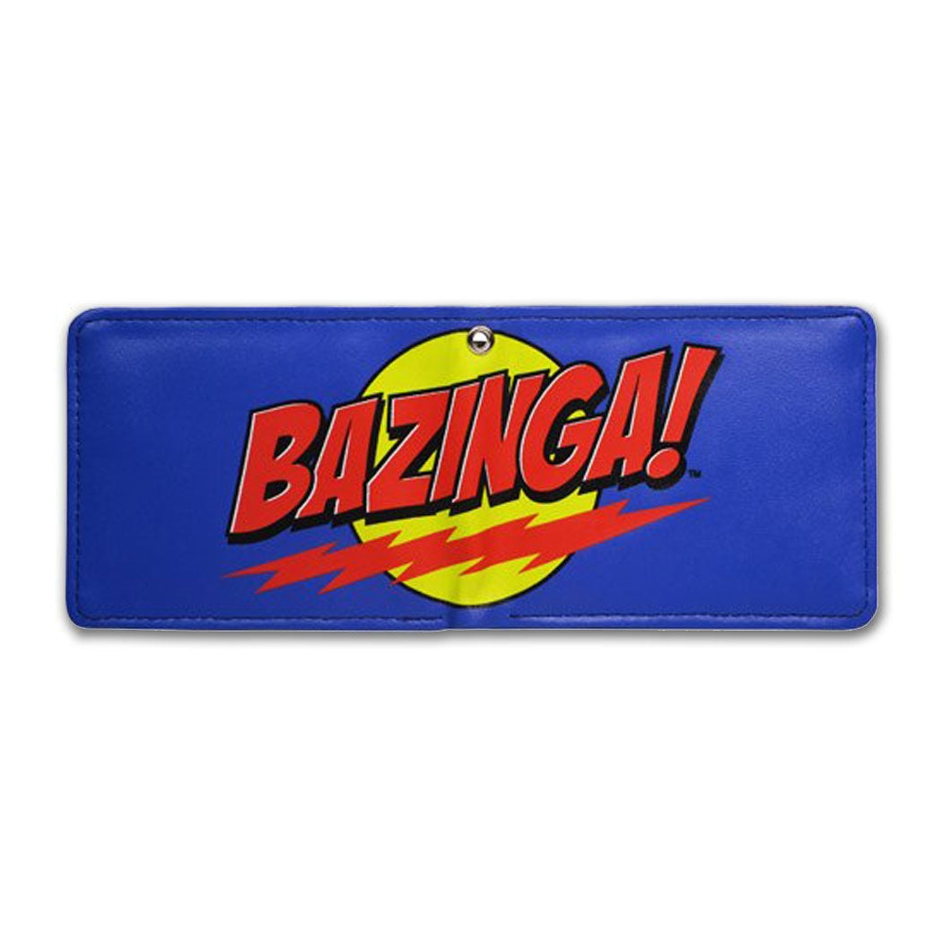 Keep your cash safe and sound with this officially licensed bi-fold men's wallet featuring Sheldon's Bazinga! catch phrase from The Big Bang Theory. This blue bi-fold wallet has large billfold pocket for money and receipts, 4 credit card pockets, 2 quick access business card pockets, 1 picture ID pocket. Size: 4" W x 3" H folded. Upper and Inner Material: Rubber / PVC. Makes a perfect gift for any Big Bang Theory fan. Check back often for some of our new Big Bang Theory clothing and other Big Bang Theory merchandise at great prices only at AnimationShops.com.